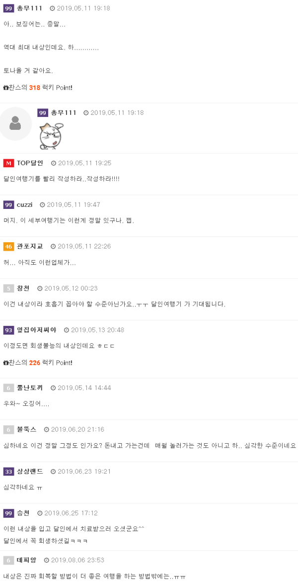 글의 컨셉을 잡는다고 한국에 복귀하고서 조금 시간이 걸렸습니다. 본편의 프롤로그로써 달인 여행전 겪은 뉴세부럭셔리여행의 내상기를 적습니다. 처음 저희 일행의 여행 일정은 베트남 자유여행으로 저녁에 가라오케에 가서 놀고 밤을 보내는 걸 계획했었습니다.&…