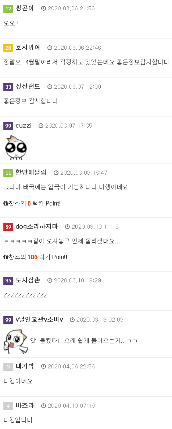 안녕하세요멍회장입니다좀전에 들어와서 이렇게 잠시 글을 남깁니다지금 이슈가 되고있는 태국 격리에대해서 말인데요전혀 그런거 없이 들어왔습니다다만 열체크가 하나 더 늘었다는거 한국인이라고해서 격리되고 이런건 없습니다저도 오기전에 걱정을 많이 했지만 도착후 다들 친절히 반겨주…