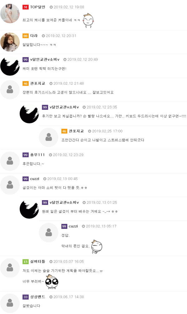사장님이 없는틈을 타서 얼렁 하나 올려 봅니다.홈피에 올린 소비의 후기 사진을 보니 내가 저렇게 찐햇나 하는생각을....다른분들껀 자리가 틀려서 찍기 어려웟나 봅니다.. 제껏만 잇네요.. 그렇게 재밋는시간을 보냇습니다...그녀는 칭찬을 들으며 제 옆에…